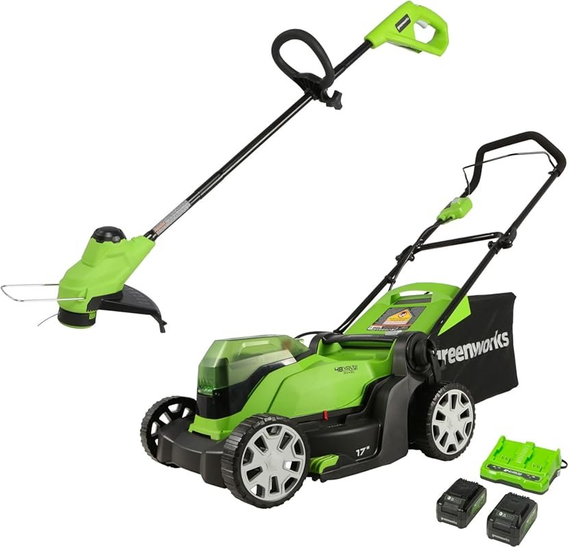 1. Greenworks 48V 17″ Cordless Electric Lawn Mower & String Trimmer Combo