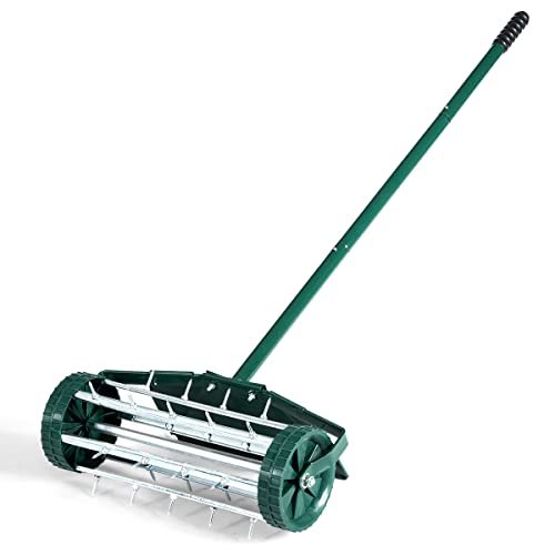 The SAFSTAR Rolling Lawn Aerator uses 18-inch tine spikes to pierce compact clay soil. Its anti-slip handle and heavy-duty design allow easy manual aeration. This tool enhances oxygen and nutrient flow, promoting better lawn health in dense clay soil.