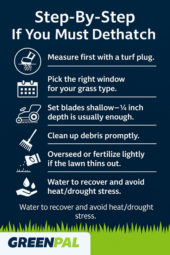 Dethatch your lawn only when needed. Doing it too often can stress grass and soil.