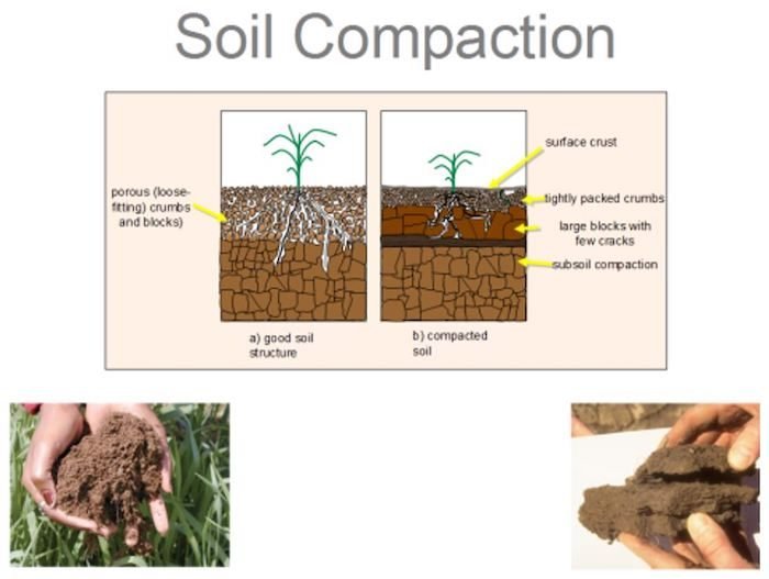 Soil compaction happens when soil particles are pressed tightly. It reduces air and water flow in the soil.