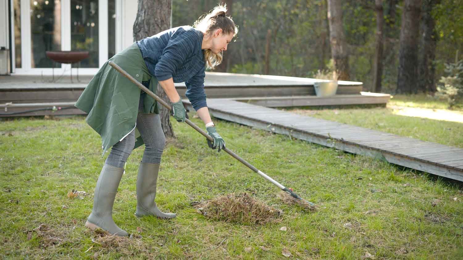 • Use a rake for areas with thick needle layers